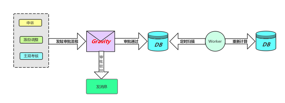 审批如果被驳回,我们会通过大象通知流程发起者;审批通过时,我们一方面会通知流程发起者,另一方面我们会把审批的详细信息存入到一张中间表中。然后通过定时调度引擎来定时扫描该表中的数据,目前是10分钟一扫描,然后依据审批信息重新计算相关人员的绩效数据,最终更新数据库中的信息,完成申诉、激励调整和主观考核的流程。