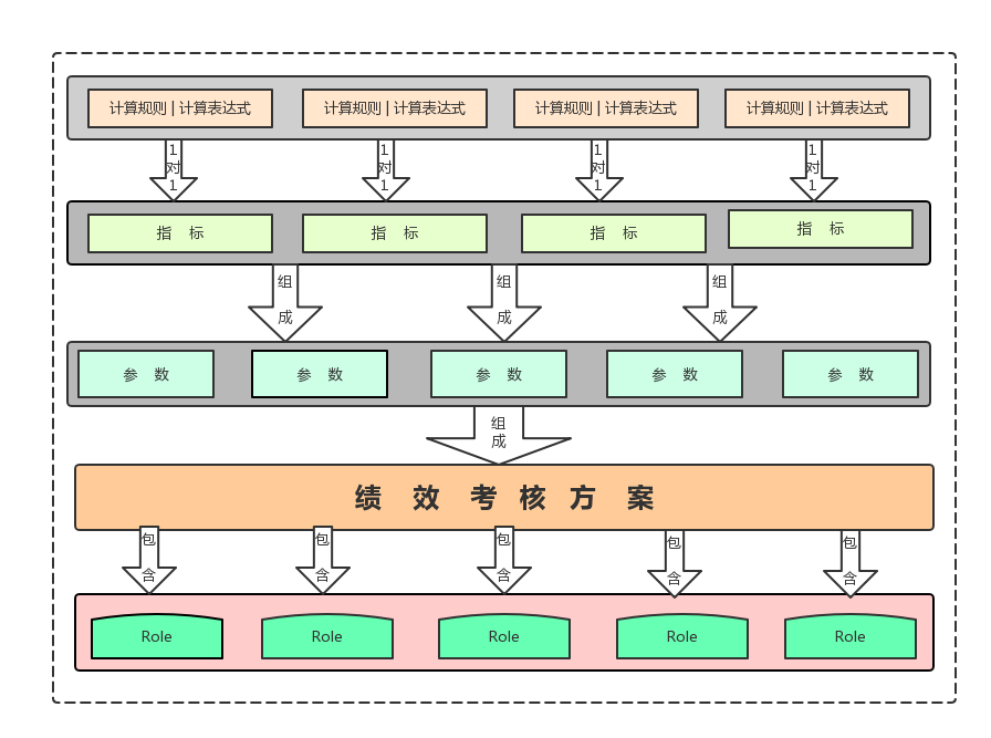 如图8所示,方案是由参数组成,而参数是由指标组成,然后针对每一个指标配置一套规则。规则是由计算规则和计算表达式两部分组成。参数是对业务人员某项业务能力的考量。当配置方案时,我们只需根据当前月的主要目的就可以进行参数的筛选,而不必每个月都从头开始创建新的方案。