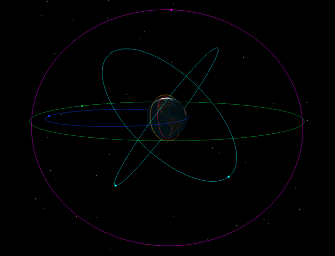 卫星根据轨道的种类不同,大致分为了以下几种:LEO低轨道、MEO中轨道、GEO高轨道、SSO太阳同步轨道、IGSO地球同步倾斜轨道、GTO同步转移轨道等等,为了能更直观地展示,我做了轨道模拟,大家可以更好的看到这些轨道的区别。