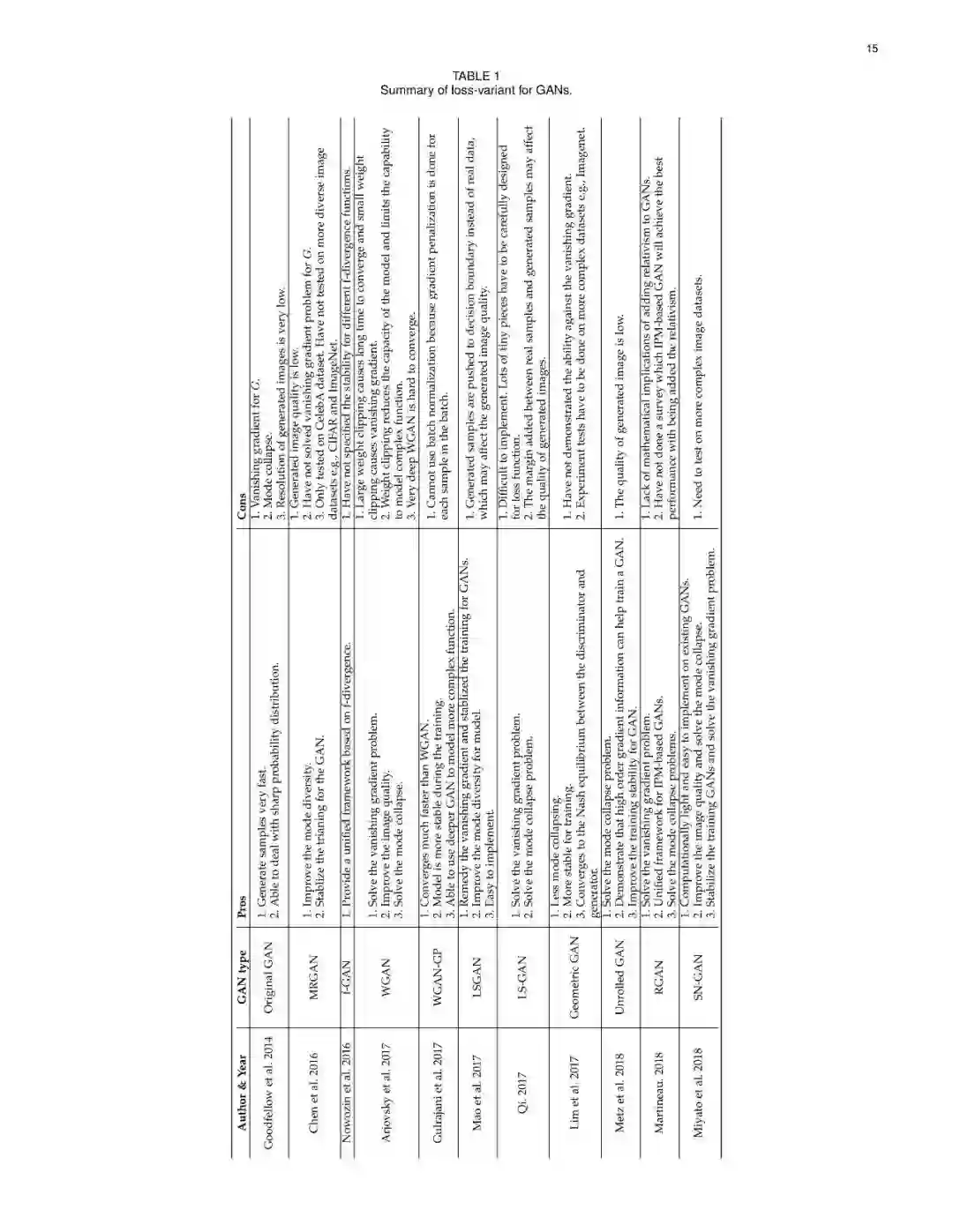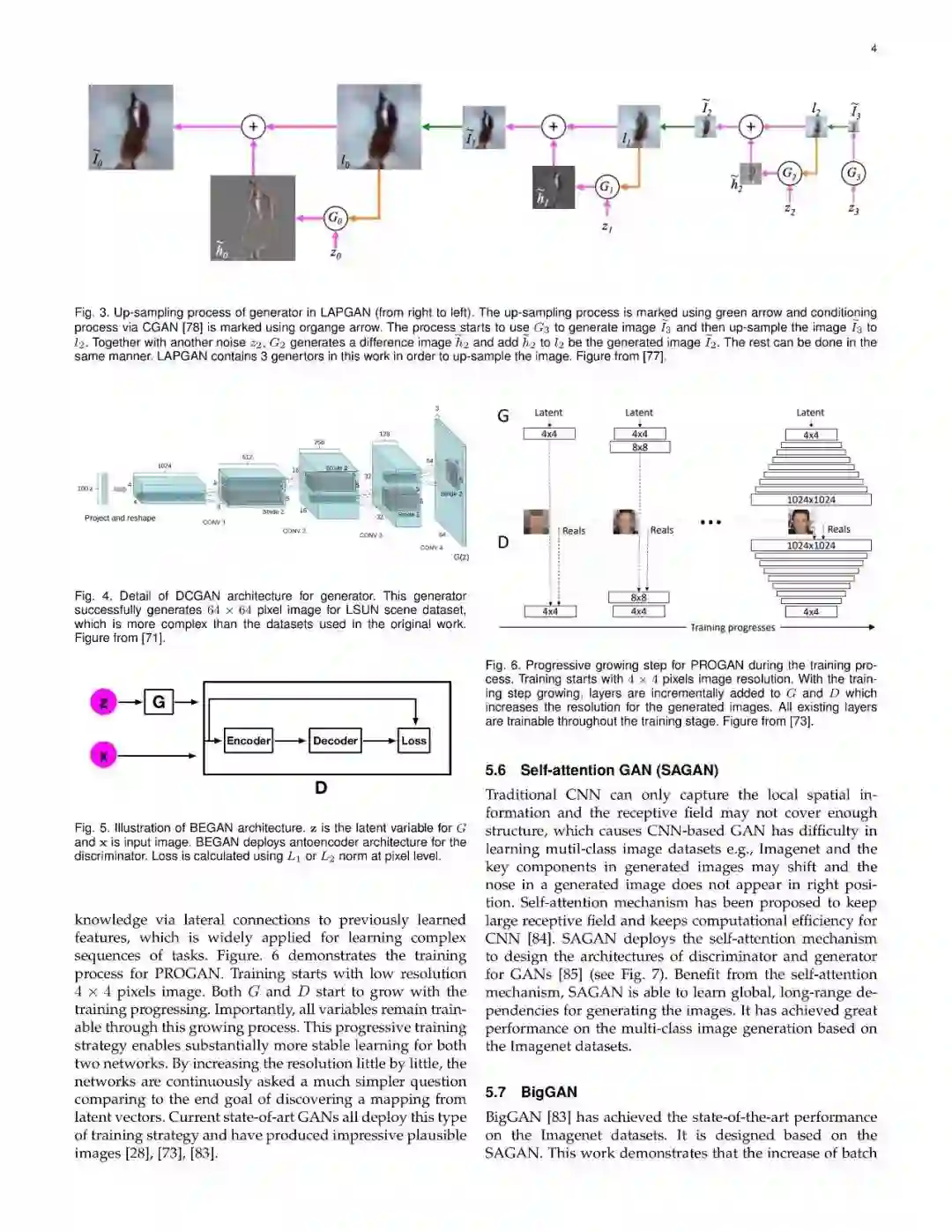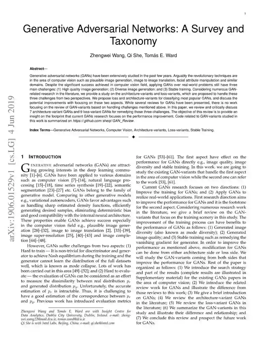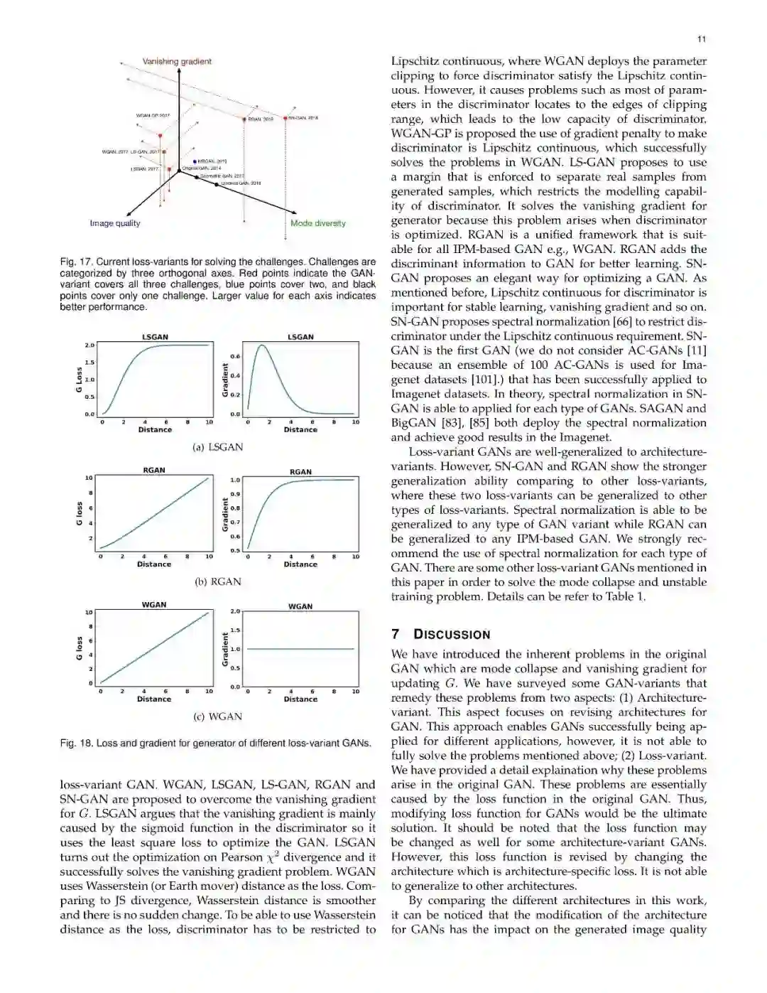 近些年来,生成式对抗网络(GANs)在机器学习领域,得到了广泛的研究,可以说是计算机领域革命性的技术成果,具有广泛的应用价值(如图像生成、图像转换、面部属性操作等)。尽管在计算机视觉领域得到了显著成功,但将GAN应用于实际问题,仍然存在着三个主要挑战:(1)高质量图像生成;(2)多样化的图像生成;(3)稳定的训练效果。考虑到文献中的大量GAN相关研究,我们提供了一个此方向的研究系统分类,从两个方向来论述了以上三个挑战。在本文中,我们回顾了7中架构及8中损失函数,并进行了相关性能分析。
