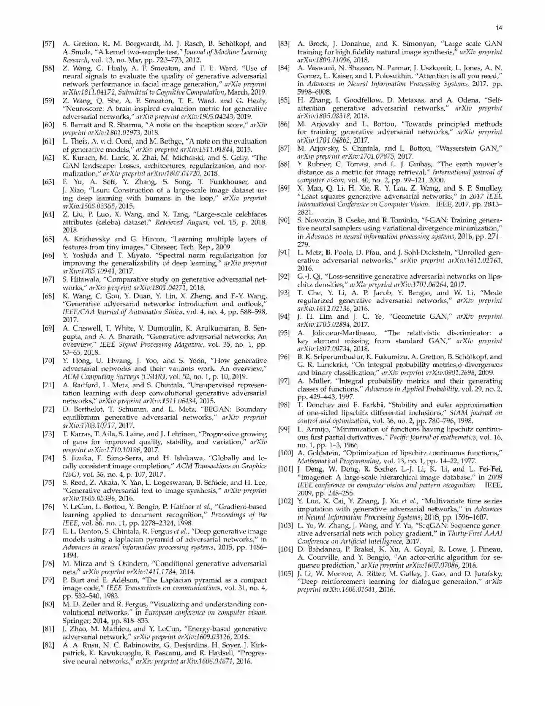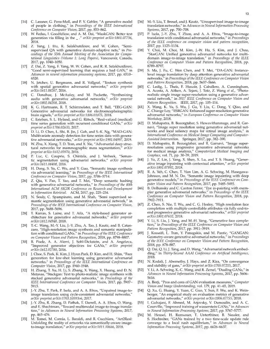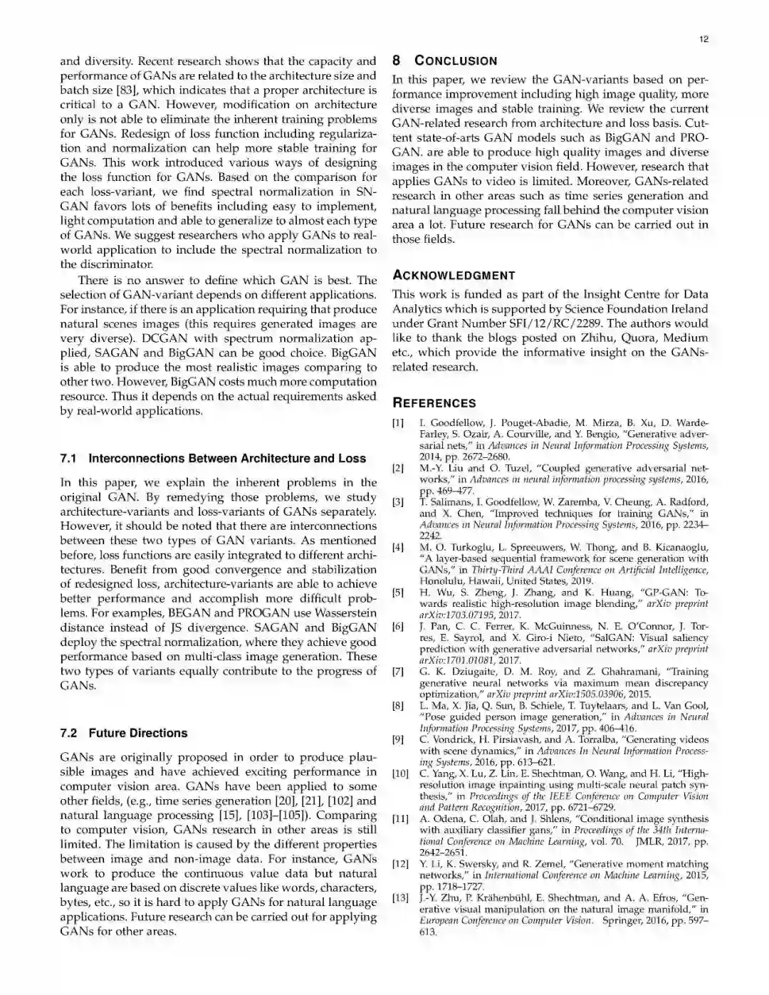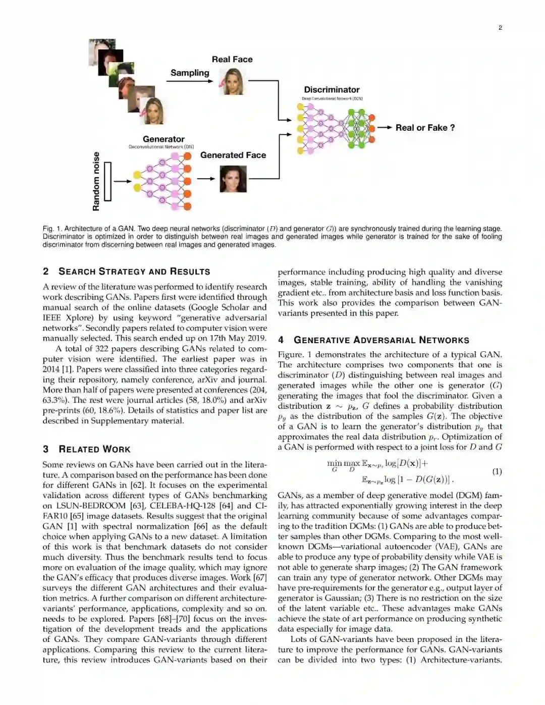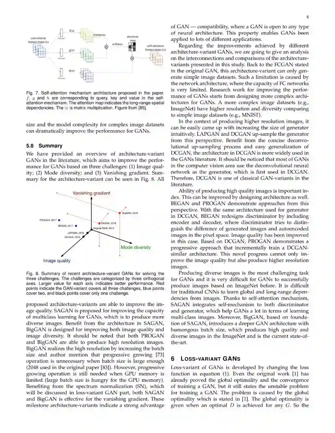 近些年来,生成式对抗网络(GANs)在机器学习领域,得到了广泛的研究,可以说是计算机领域革命性的技术成果,具有广泛的应用价值(如图像生成、图像转换、面部属性操作等)。尽管在计算机视觉领域得到了显著成功,但将GAN应用于实际问题,仍然存在着三个主要挑战:(1)高质量图像生成;(2)多样化的图像生成;(3)稳定的训练效果。考虑到文献中的大量GAN相关研究,我们提供了一个此方向的研究系统分类,从两个方向来论述了以上三个挑战。在本文中,我们回顾了7中架构及8中损失函数,并进行了相关性能分析。