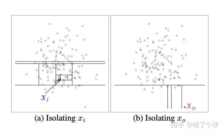 为了更直观,有更多一步了解,请看下图,直觉上我们就知道xi是普通点, x0是异常点。那么用Isolation tree怎么解释呢?