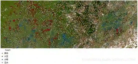 采用了异常检测的思想,使用孤立森林(iForest、Isolation Forest)模型,将其他类当作“异常”类,从而增加第四类样本。我们以三类训练样本中心点取得大小为7x7x3的数据参与模型训练,在训练的高分影像数据上随机选点,并将预测值等于1也就是异常的样本加入训练集。该步骤选择了3000个“其他”类别地物样本。