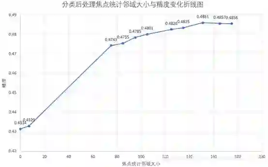 表6.3 焦点统计邻域大小与精度折线图,0表示没有进行焦点统计即原始预测输出。