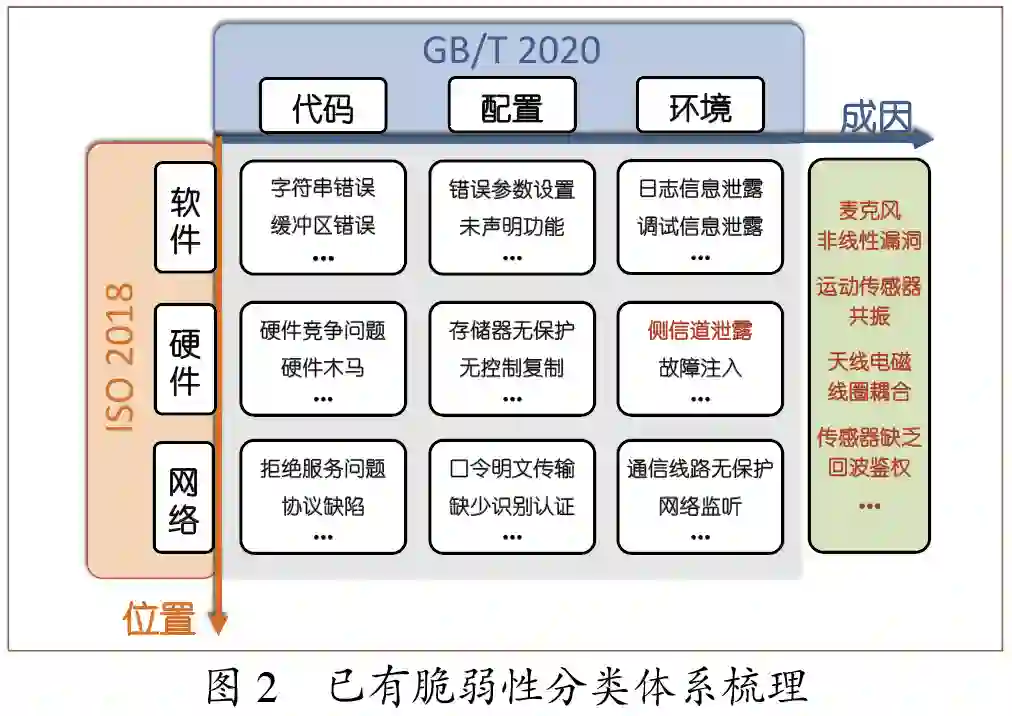 在脆弱性演化的同时,人们对脆弱性的认知也在变化。本文从脆弱性的发生位置和产生成因两个角度对现有的脆弱性分类体系进行了整理,如图2所示。1998年制定的第一个安全漏洞相关的国际标准ISO/IEC 13335[3]从脆弱性出现的位置出发,将脆弱性来源分为硬件、软件、通信等7种类型。2013年我国制定了第一个安全漏洞相关的国内标准GB/T 30279[4],并在2020年的修订版中从脆弱性的成因出发进行分类,构建了由“代码问题”“配置错误”“环境问题”“其他”四个方面组成的脆弱性体系。国际和国内标准较完备地总结归纳了传统脆弱性,并在国标2020年的修订版[5]开始考虑除此之外的个别与“物理-数字”跨域交互相关的脆弱性,例如将侧信道信息泄露归入“环境问题”中的“信息泄露”子类。但在现有体系下,智能系统的新型脆弱性无法被全部覆盖,例如“海豚音攻击”利用麦克风的非线性脆弱性,通过发射人耳不可听的超声波唤醒语音助手等。