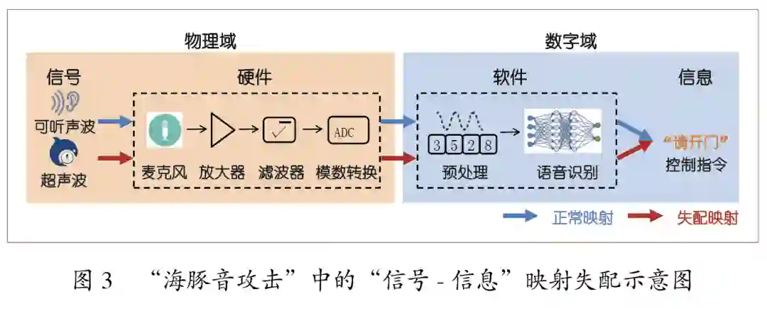 跨域交互带来映射失配。传感器与执行器是智能系统实现跨域交互的重要组成部分。传感器负责从外部感知信息,执行器负责向外部表达信息,两者共同完成了数字域和物理域之间的“信息-信号”映射。映射失配可理解为系统存在不属于设计功能的域间映射。例如,语音助手(智能系统)本应该只接收人的语音指令(正常信号),但通过利用麦克风(传感器)的非线性缺陷,超声波(异常信号)同样可以让语音助手接收语音指令(映射后的信息)。现有的脆弱性挖掘手段主要集中于设计功能和信息间的映射,因而无法找到并解决此类非功能设计的跨域映射失配问题。