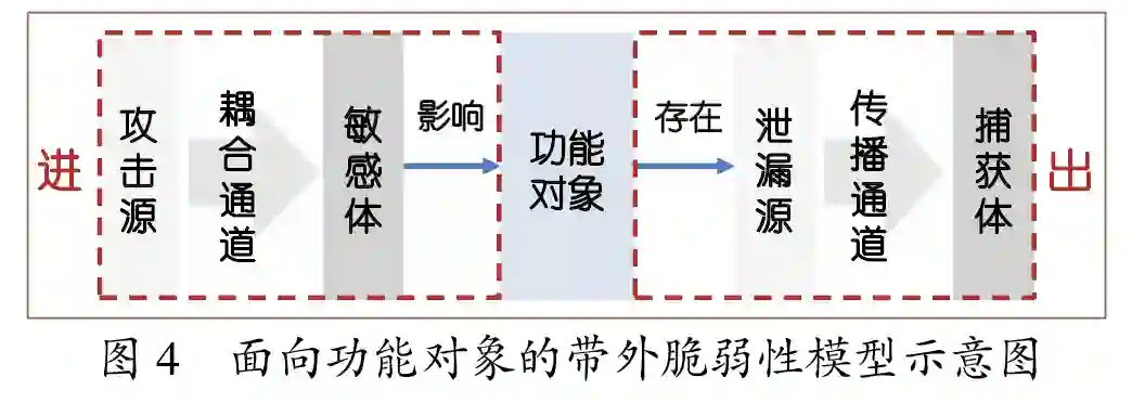 面向功能对象的带外脆弱性模型。带外脆弱性面向的主体为功能对象,其作用链路可抽象为包含“攻击源-传导通道-脆弱点”的三元模型。如图4所示,根据攻击流在三者中的走向,带外脆弱性模型可进一步分为信号主动注入模型与信号被动导出(输出)模型,即“进-出”和“主-被”双向链路。首先,对于信号主动注入模型,攻击者利用攻击源主动发射攻击信号,将其耦合于目标功能对象的信号传输通道,并最终作用在目标功能对象的敏感体上以实现攻击。例如,攻击者可通过发射特定频率的无线电信号,将其耦合在心脏起搏器的导线上,导致心脏起搏器异常工作,比如当病人心跳停止时,发射恶意射频信号并耦合出虚假心跳信号,使心脏起搏器不能及时输送起搏治疗信号,从而造成严重的医疗事故[6]。其次,对于信号被动导出(输出)模型,功能对象的泄露源由于信号伴生效应,被动泄露信息内嵌的物理信号,并在经过传播通道后被攻击者的捕获体获取。攻击者通过解析泄露的信号获取功能对象的敏感信息。例如,攻击者可以通过分析高性能计算机执行加密指令时所产生的功耗电信号或电磁辐射信号[7]来推断所使用的加密密钥,从而威胁相关设备与服务的安全。