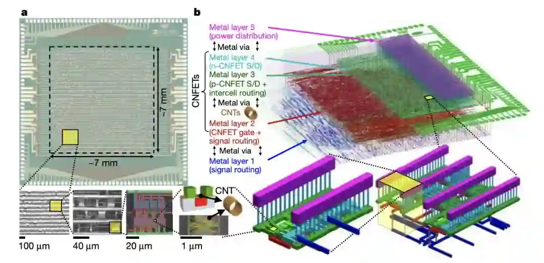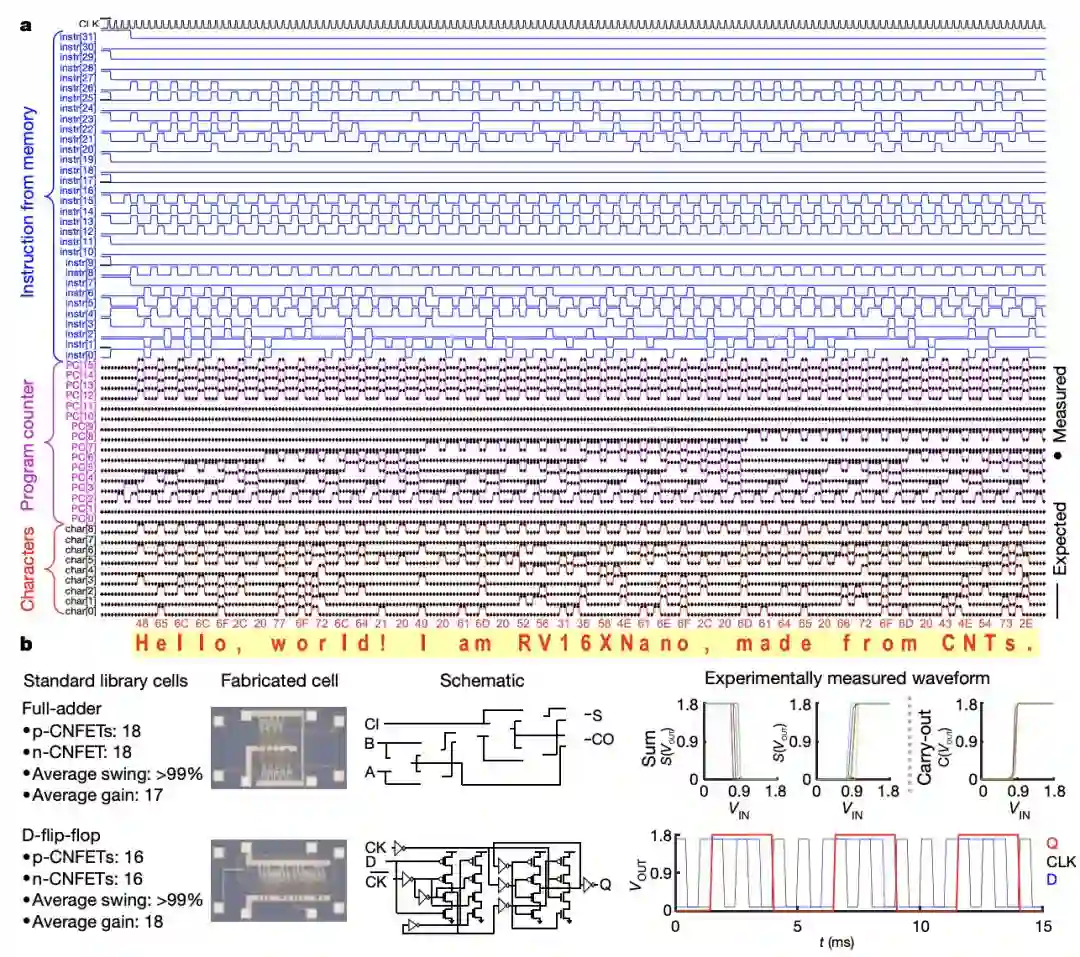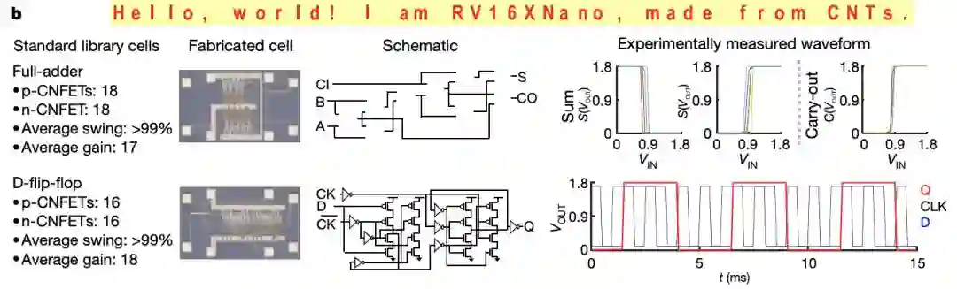 在这项工作中,作者克服了固有的CNT缺陷和变化性,成功制造出超越硅的现代微处理器:RV16X-NANO,其设计和制造完全使用碳纳米管晶体管。