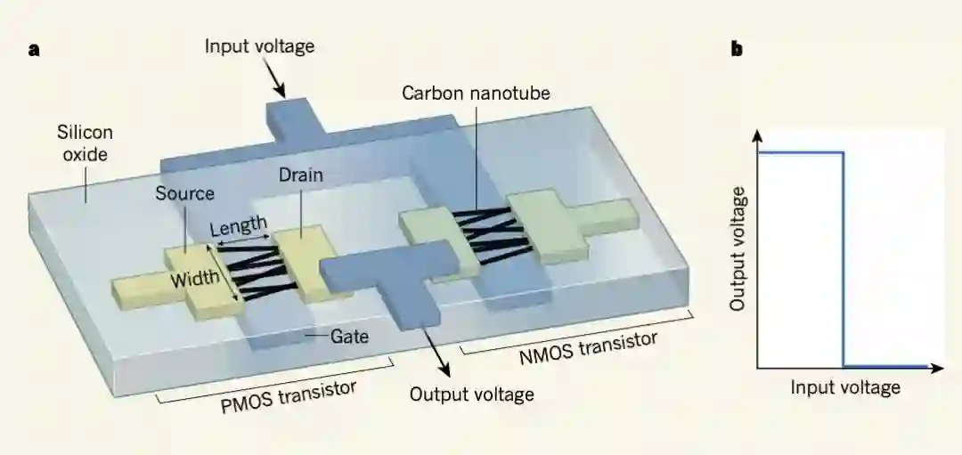 当一个负(或正)电压被施加到一个称为栅极的电极上时,PMOS(或NMOS)晶体管就被接通。该电极控制两个电极(源极和漏极)之间通道的导电性(在本例中通道由碳纳米管组成)。当一个PMOS晶体管和一个NMOS晶体管串联时,结果是一个称为逆变器(inverter)的元件(如下图所示)。如果对这样的逆变器施加低电压,输出电压就会很高,反之亦然。这个元件是Hills及其同事设计的计算机中所有逻辑电路的基本组成部分。