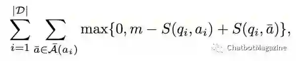 中的一个负样本(错误答案),m 是一个值为 0.1 的 margin。最小化这个损失函数,意味着我们希望正确答案和问题的得分要比任意错误答案的得分高出一个 margin。