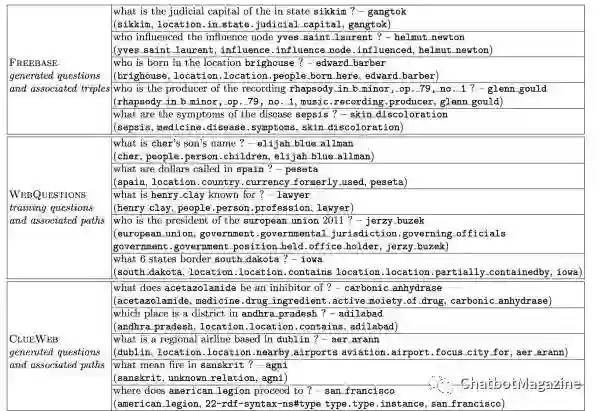 Freebase:选取 freebase 中包含出现频率高于 5 次实体的三元组,得到一个知识库子集(含 2.2M 实体和 7K 关系),对于每一个三元组如(subject, type1.type2.predicate, object),我们通过自动化的方式,生成这样的问题答案对: