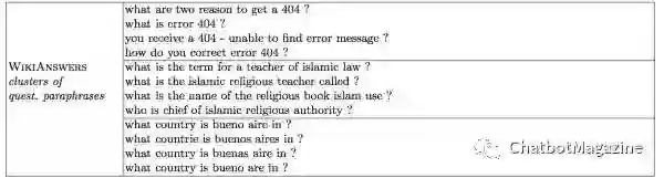 因此,作者在 WikiAnswers 中抓取了 2.2M 问题(不含答案),通过问题的分类标签,将它们分为了 350k 个类簇(可以理解为每个类簇里的自然语言问题它所表达的意思是一样的)。