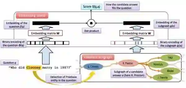向量建模方法的思想和信息抽取的思想比较接近。首先根据问题中的主题词在知识库中确定候选答案。把问题和候选答案都映射到一个低维空间,得到它们的分布式表达(Distributed Embedding),通过训练数据对该分布式表达进行训练,使得问题向量和它对应的正确答案向量在低维空间的关联得分(通常以点乘为形式)尽量高。