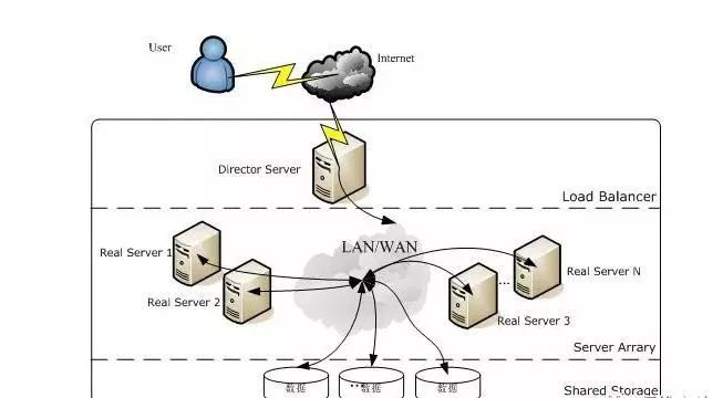 Server Array 层:由一组实际运行应用服务的机器组成,Real Server 可以是 Web 服务器、Mail 服务器、FTP 服务器、DNS 服务器、视频服务器中的一个或者多个,每个 Real Server 之间通过高速的 LAN 或分布在各地的 WAN 相连接。在实际的应用中,Director Server 也可以同时兼任 Real Server 的角色。