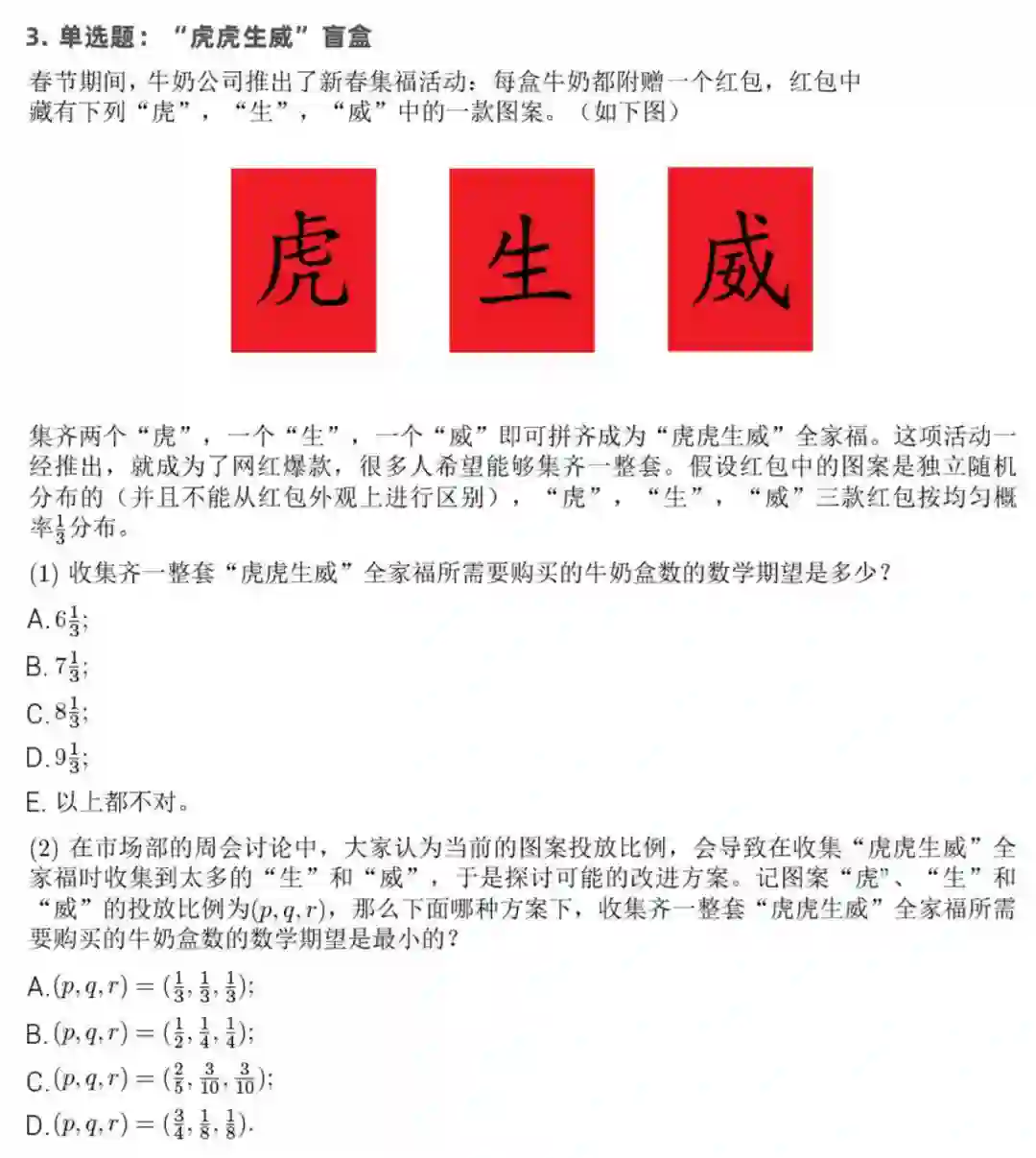 第 3 道单选题关于「虎虎生威」盲盒概率分布,也分为两小问。