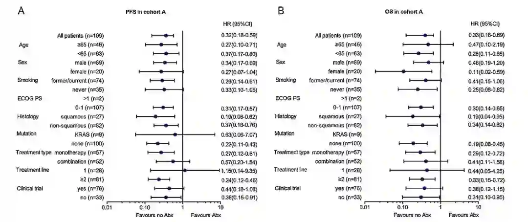单因素和多因素分析的结果总结见表3A和表3B。在单因素分析中,我们发现接受抗生素治疗的患者相比于未接受抗生素治疗的患者,有显著更短的PFS(HR 0.32,95% CI 0.18~0.59,P<0.0001)和OS(HR 0.33,95% CI 0.16~0.69,P=0.003)。ECOG PS≥2分和鳞癌患者同样显示出显著更短的PFS和OS。然而,接受一线免疫治疗和参加临床试验的患者,有显著更长的PFS和OS。将这些在单因素分析中,P<0.1的变量均纳入多因素分析,发现在调整其他变量后,接受抗生素治疗仍然是PFS(HR 0.29,95%CI 0.15~0.56,P<0.0001)和OS(HR 0.35,95%CI 0.16~0.77,P=0.009)的独立预测因子。