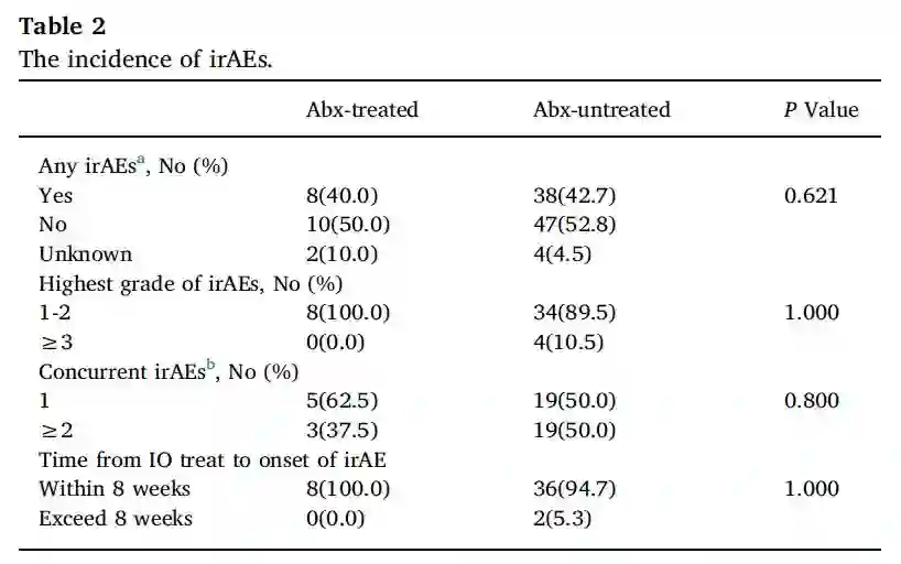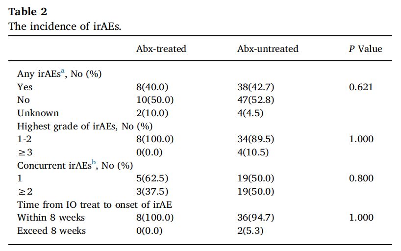 在接受免疫治疗的患者中,观察到46例(42.2%)患者出现任意级别的免疫相关不良事件(irAE)。最常见的irAE为皮炎,发生率为20.8%(16例)。如表2所示,大多数患者为轻度irAE(1~2级),没有患者因为irAE中止治疗。总体而言,接受和未接受抗生素治疗的患者,irAE的发生率无显著差异(P=0.621);此外,两组患者irAE的严重程度也无显著差异(P=0.8)。