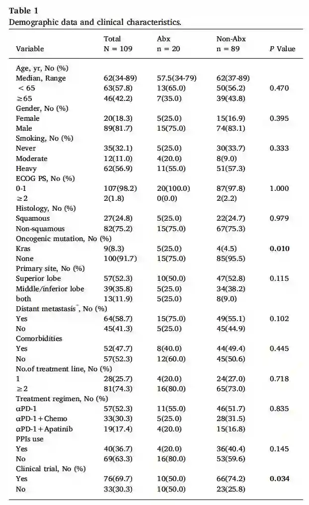 研究共连续入组了142例接受免疫检查点抑制剂治疗的晚期NSCLC患者,其中109例患者可以进行疗效评估,纳入本次分析。所有符合入组标准的患者均为EGFR/ALK野生型。57例患者接受PD-1单抗单药治疗(包括帕博利珠单抗、纳武利尤单抗或SHR-1210),33例接受PD-1单抗联合化疗,19例接受PD-1单抗(SHR-1210)联合抗血管生成治疗(阿帕替尼或贝伐珠单抗)。根据患者是否使用抗生素将其分为2组:20例(18.3%)患者在接受PD-1单抗治疗前后1个月内使用过抗生素,其余89例(81.7%)患者定义为未接受抗生素治疗组。接受和未接受抗生素治疗的患者,基本的临床特征相似,患者的基线临床特征总结见表1。
