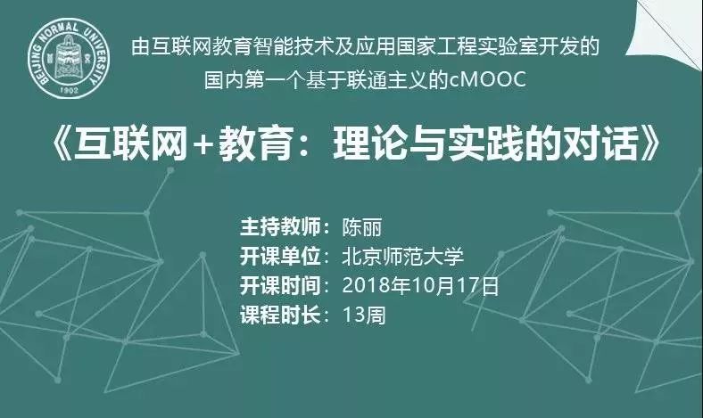 《互联网+教育:理论与实践的对话》是由北京师范大学陈丽教授主持、互联网教育智能技术与应用国家工程实验室联合开发的,基于联通主义理论的cMOOC课程。课程以“开放”、“共享”、“互动”、“创新”为指导,关注互联网推动教育创新的实践策略和创新理论,旨在帮助所有参与者建立起个人与典型创新企业、研究机构、关键人物、文献资源之间的连接,形成互联网教育领域的社会联通网络,并最终建构出包括研究者、企业创新实践者、管理人员在内的互联网教育领域的综合性高端研究社区。本课程共13周,将结合互联网推动教育变革的典型趋势,围绕“互联网+教育”创新的5个专题,以及3次学术研讨,邀请国内互联网教育领域的代表性创新企业,以及这个领域的专家、学者和管理人员与各位一起共同探讨、共建内容。