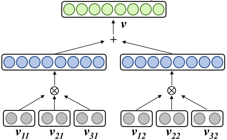 表示张量积。Word2ket 只需要存储和使用这些低维的向量来构建高维的词向量,从而实现参数有效降低。例如,r =2、n=3时,一个维度为 512 的词向量,可以通过两组,每组三个维度为 8 低维向量张量积得到,此时所需参数量从 512 降低至 48。