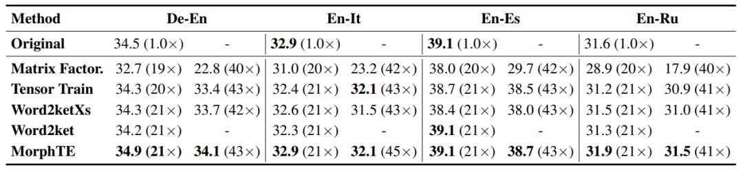 从表格中可以看到,MorphTE 可以适应英语、德语、意大利语等不同语言。在超过 20 倍压缩比的条件下,MorphTE 能够保持原始模型的效果,而其他压缩方法几乎都出现了效果的下降。此外,在超过 40 倍压缩比的条件下,MorphTE 在不同数据集上的效果都要好于其他压缩方法。