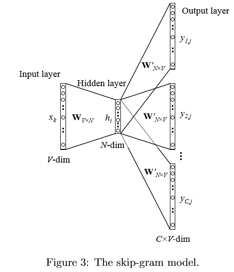 Skip-gram模型是由Mikolov等人提出的。下图展示了Skip-gram模型的过程。该模型可以看做是CBOW模型的逆过程,CBOW模型的目标单词在该模型中作为输入,上下文则作为输出。