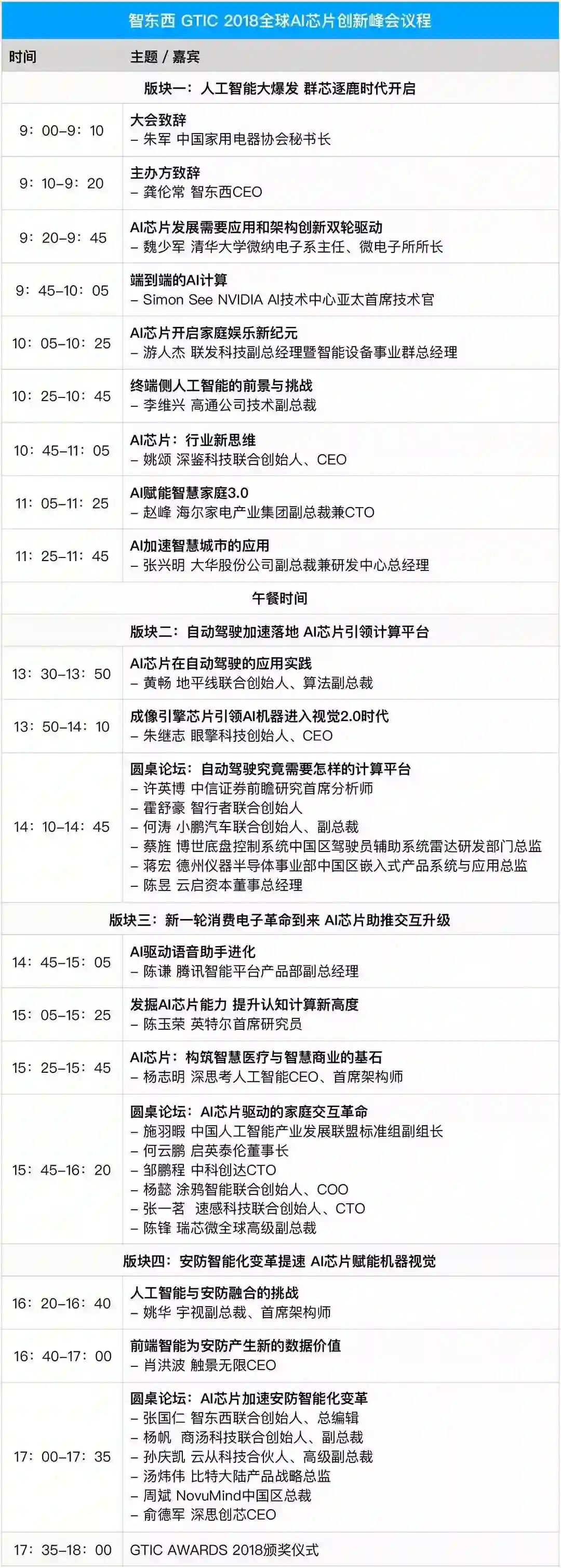 GTIC 2018分为上午场和下午场,将分为五个版块进行,上午为版块一“人工智能大爆发 群芯逐鹿时代开启”;下午的三个版块分别为“自动驾驶加速落地AI芯片引领计算平台”、“新一轮消费电子革命到来AI芯片助推交互升级”和“安防智能化变革提速AI芯片赋能机器视觉”。