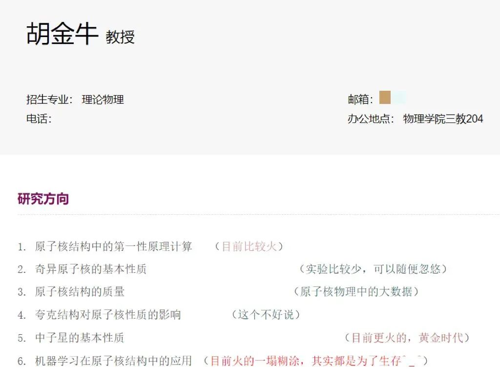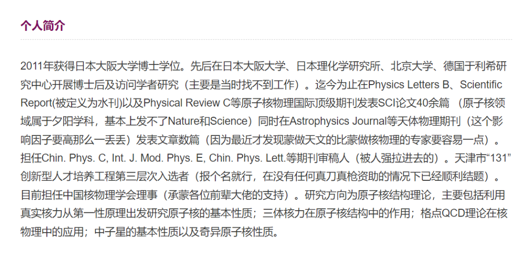 在个人简介方面,胡教授会在一长串的学业研究经历后补充:“主要是当时找不到工作”,在提到目前担任中国核物理学会理事时,他会谦虚表示“承蒙各位前辈大佬支持” ……