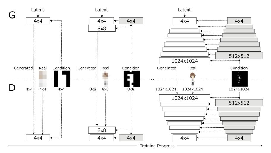 日本游戏公司 DeNA 利用渐进式结构条件生成对抗网络(PSGAN)这一新框架生成高分辨率全身动漫人物图像,该方法能够生成高分辨率图像,且具备结构一致性。此外,该方法还可以轻松实现动漫人物换装和添加动作。