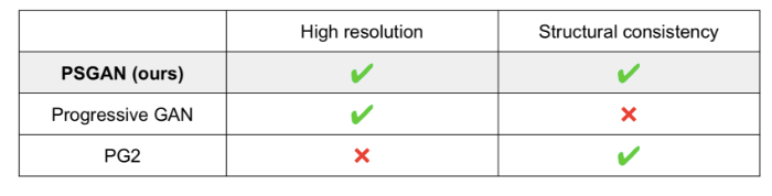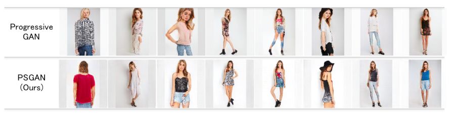 上图所示是用 Progressive GAN [Karras+18] 和 PSGAN 在 DeepFashion [Liu+16] (256*256) 数据集上生成的图像。通过观察可以看出 Progressive GAN 不能生成与全局结构一致的自然图像(例如左边四张图)。而 PSGAN 可以通过在每个尺度上添加结构条件生成与全局结构一致的合理图像。