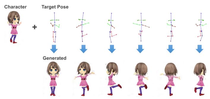 下图展示了使用特定动漫人物和目标姿势生成一段动画的示例: