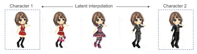 我们用 PSGAN 插入对应身穿不同服饰的动漫形象(人物 1 和人物 2)的隐变量,来生成新的动漫人物的全身图像。注意,这里只需要一个姿势。