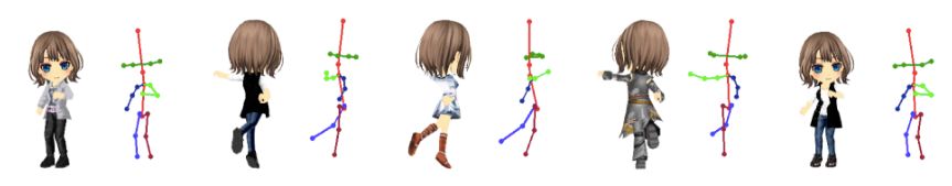 我们用包含 600 个姿势和 69 类服饰的 Unity 3D Avatar 模型创建了一个全新的数据集,该数据集包含分辨率为 1024*1024 的全身图像以及精准的 2D 姿势关键词。下图是创建数据的示例。动漫形象(每对图的左侧)和姿势图像(每对图的右侧)如下图所示。