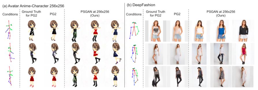 上图所示是 PSGAN 和姿势引导的人像生成模型(Pose Guided Person Image Generation,PG2)[Ma+17] 在 256*256 版的 Avatar 数据集和 DeepFashion 数据集上生成的图像。从上图可以看出,由于在每个尺度上添加了结构条件,PSGAN 生成的图像比 PG2 更清晰,细节也更多。