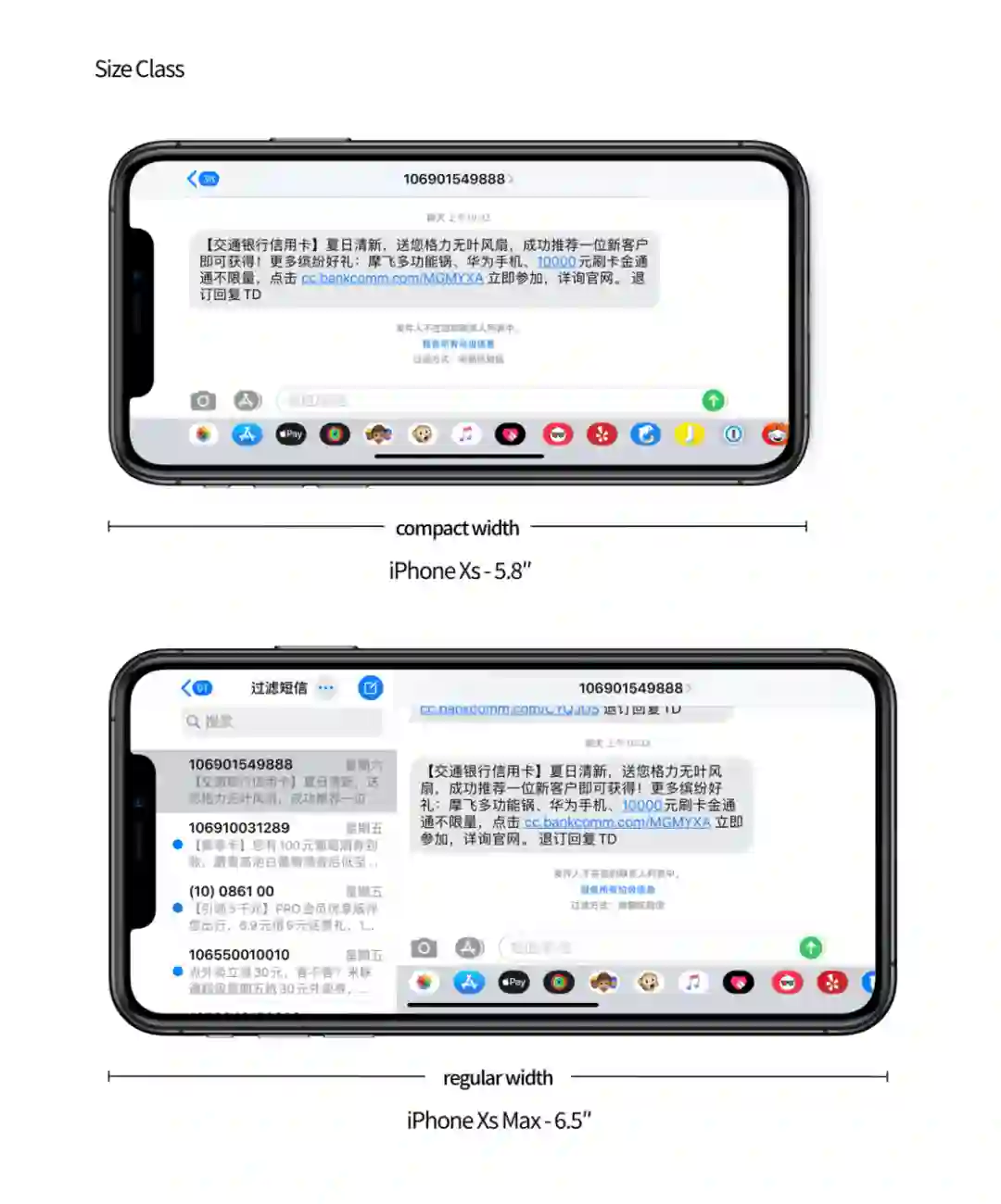 据此进一步印证了 6.5 寸的 iPhone Xs Max 的存在。同一个 app 在不同屏幕尺寸的屏幕上显示的内容布局不同,究其原因,如下图所示,在屏幕宽度上 5.8 寸屏幕的 Size Class 是「compact width」,6.5 寸屏幕的 Size Class 是「regular width」,Size Class 不同,所以它们的 app 内容显示布局不一样。
