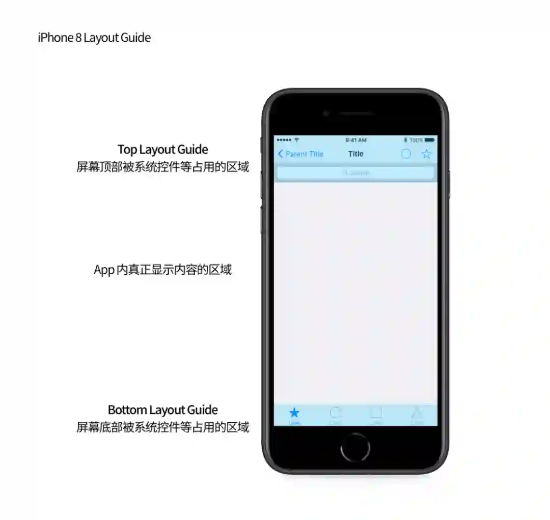 如下图所示,在 iPhone 8 上,屏幕顶部的状态栏、导航栏、搜索栏的区域称为「Top Layout Guide」,屏幕底部的标签栏的区域称为「Bottom Layout Guide」,app 内真正显示的内容应该在这两者之间进行布局。由于屏幕是一个规则的矩形,无论是竖屏还是横屏,系统控件只会出现在屏幕顶部和底部,屏幕左右两侧是不受约束的。