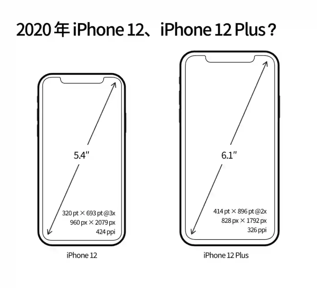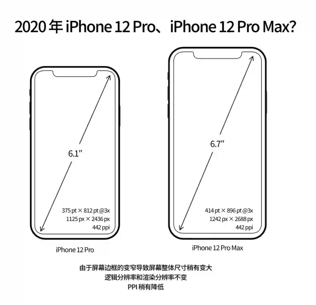 根据之前 iPhone 屏幕逻辑分辨率的进化规律,我认为 Apple 对于逻辑分辨率的改变是比较谨慎的,因为新的逻辑分辨率对设计师和开发者就意味着新的设计、适配和开发工作,iPhone 的屏幕尺寸就会更加碎片化,所以如果 iPhone 12 Pro 的尺寸真的是 6.1 寸和 6.7 寸,猜测屏幕尺寸的整体变大可能是由于屏幕边框变窄导致,iPhone 12 Pro 系列的屏幕逻辑分辨率和渲染分辨率应该与上一代保持一致,PPI 稍有降低。