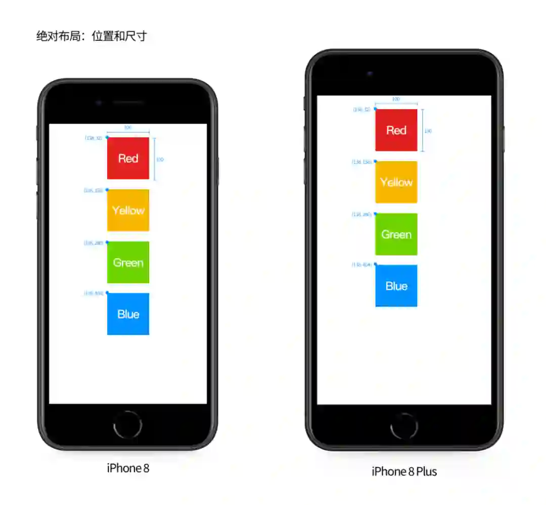 当把上面确定的每个方块的绝对布局参数放到 iPhone 8 Plus 的屏幕上显示时,我们就会发现四个方块在屏幕上显示的位置有些奇怪。仔细思考下,在 iPhone 8 的屏幕上四个方块的位置坐标之所以可以确定下来,是因为我们想要这四个方块在屏幕水平方向上是居中对齐的。当移动到 iPhone 8 Plus 的屏幕上,屏幕的逻辑分辨率发生了变化,屏幕变宽了,如果还是按照之前的位置参数放置四个方块,其自然不会在屏幕水平方向上处于居中对齐的位置了。