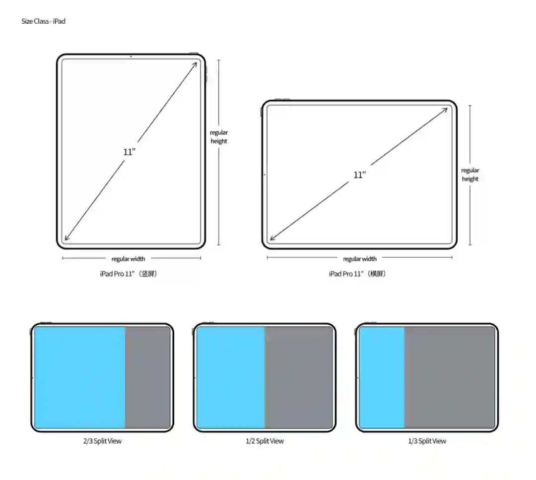不同屏幕尺寸、不同屏幕方向的 iPad 也同样有 Size Class 的定义,如 iPad Pro 11 寸在竖屏时是「regular width,regular height」,在横屏时也是「regular width,regular height」。特别的,从 iOS 9 开始,iPad 上的 app 支持以 Slide Over 侧拉或者 Split View 分屏浏览的形式显示,在这些使用场景中,它们也被定义了 Size Class。