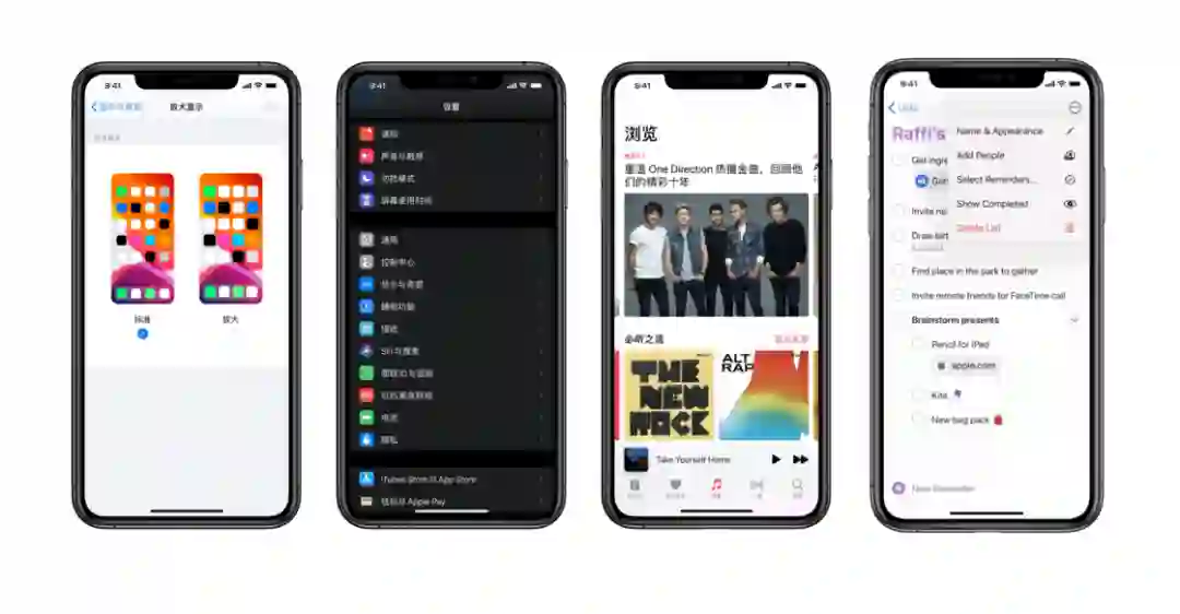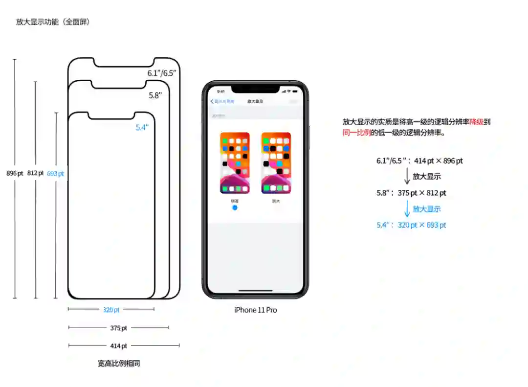 前文提到,从 iPhone 6 开始,iOS 在部分机型中新增了「放大显示」功能,放大显示的实质是将高一级的逻辑分辨率降级到同一比例的低一级的逻辑分辨率。在全面屏 iPhone 中,6.1 寸、6.5 寸的 iPhone 具备放大显示的这个条件,所以这两种尺寸的 iPhone 在系统中同样可以开启放大显示模式;但 5.8 寸的 iPhone 不存在比它还要低一级的同一比例的逻辑分辨率,所以 5.8 寸的 iPhone X、iPhone Xs、iPhone 11 Pro 一直没有放大显示功能。