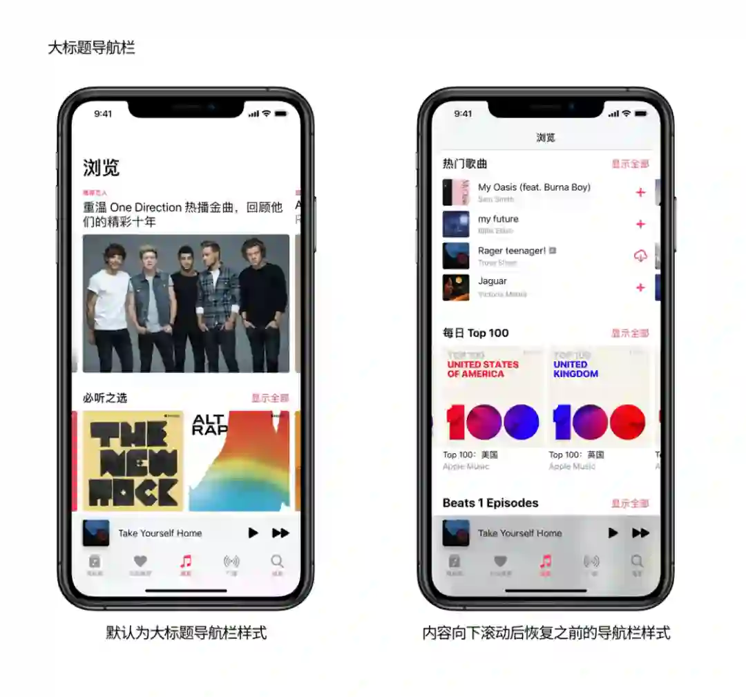 从 iOS 11 开始,为了让用户更加明确自己处于 app 的哪个位置,让 app 突出自己的核心模块,系统引入了一种新的导航栏样式:大标题导航栏,它比以前的导航栏样式更加醒目,在纵向上占据了更多的屏幕空间,这增强了刚进入这个页面的用户的空间感,而当用户滚动 app 的内容时,用户已经知道所处的位置,大标题导航栏又可以自动地缩小,以让此时的用户把注意力放在内容本身上。