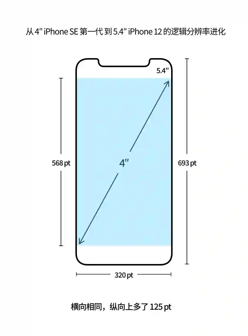 可以看出 5.4 寸 iPhone 12 的逻辑分辨率的宽度与 4 寸的 iPhone SE 第一代是相同的,都是 320pt。5.4 寸的 iPhone 12 的屏幕变化实质也是「横向不变,纵向变长」,相比 iPhone SE 第一代,纵向上多了 125pt,当 app 没有适配新尺寸的 iPhone 时,上下会出现黑边。这样来看,5.4 寸的 iPhone 12 就是之前大家翘首以待的全面屏 iPhone SE。