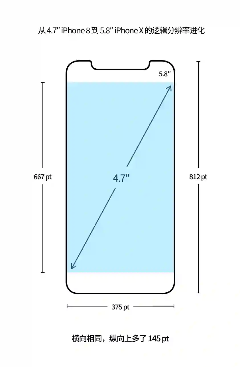 5.8 寸的 iPhone X 的逻辑分辨率为 375×812pt,比例因子为 @3x。逻辑分辨率在横向上是与 4.7 寸的 iPhone 8 的屏幕相同的,在纵向上比 iPhone 8 多了 145 pt,纵向上可以显示更多内容了。所以 iPhone X 的逻辑分辨率实际上是对 iPhone 8 的逻辑分辨率「横向不变,纵向变长」得来的,这与从 iPhone 4s 到 iPhone 5 的屏幕进化方式相同。