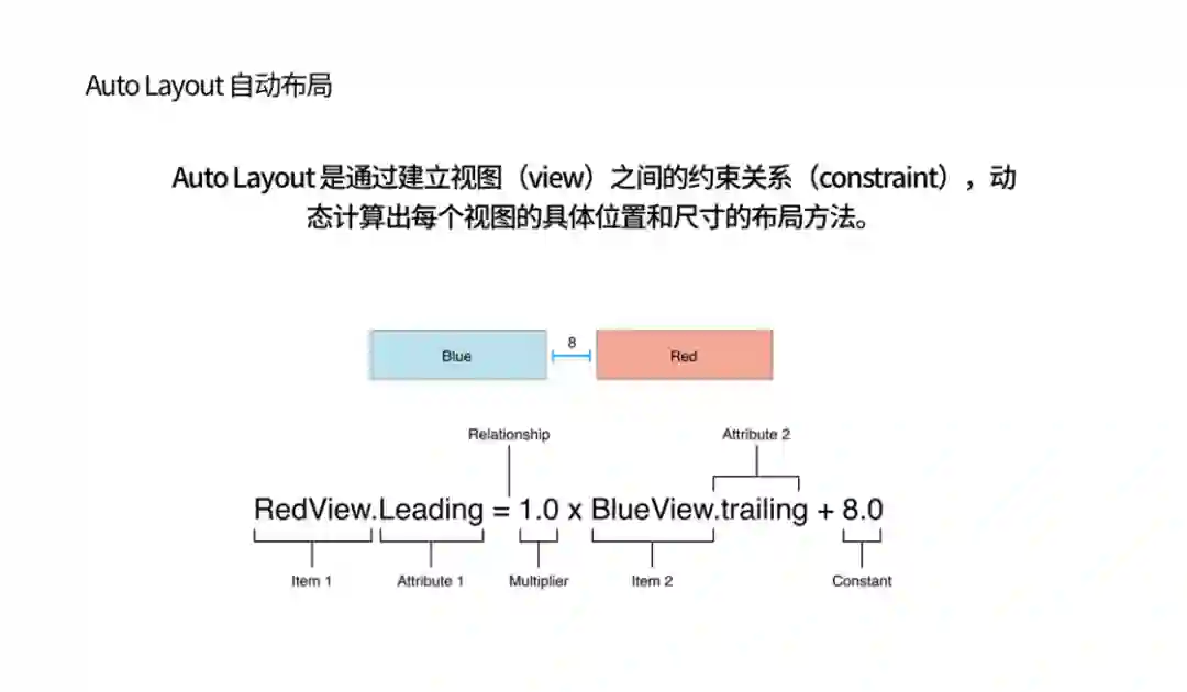 来看下图中的这个例子,蓝色方块命名为「BlueView」,红色方块命名为「RedView」,它们之间的距离是 8,通过图中所示的等式就可以表示出这两个 view 之间的约束关系,用自然语言来描述就是: