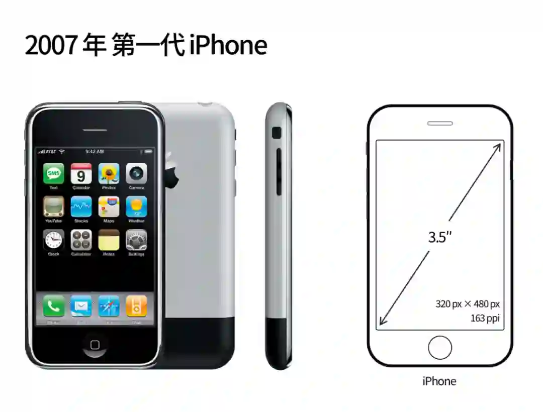 第一代 iPhone 于 2007 年发布,配备 320×480 像素(pixel,可简写为 px)的 3.5 寸屏幕,PPI (表示每英寸所具有的像素数,数字越大清晰度越好)为 163,这块支持多点触控的小屏幕开创了 iPhone 历史的先河。