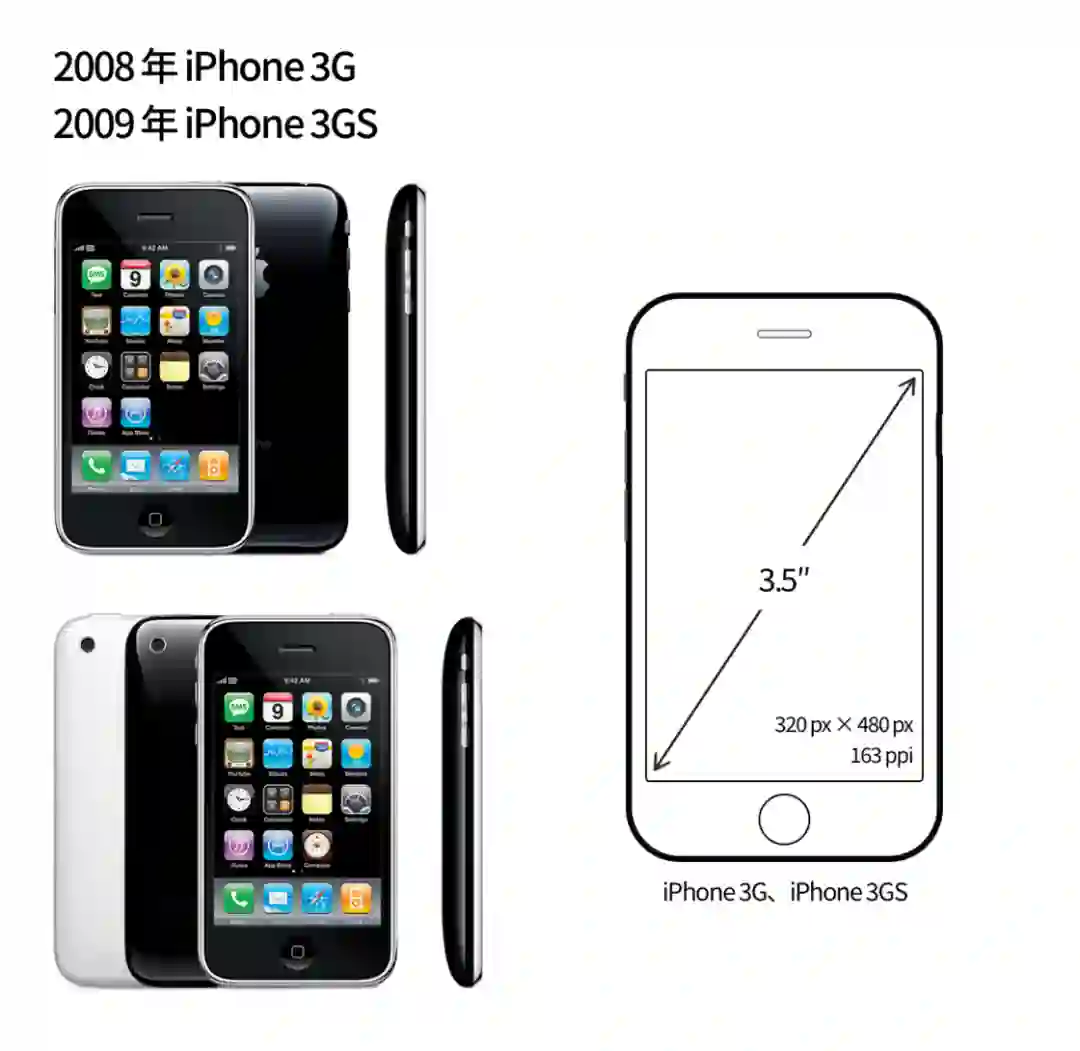 2008 年 iPhone 3G 发布,其搭载的 iPhone OS 2.0 系统首次支持了 App Store 功能,自此第三方 app 开始逐渐在 iPhone 上大放异彩;2009 年 iPhone 3GS 发布,相比前一代,其屏幕从 18 位色升级到了 24 位色,屏幕表现更加丰富。iPhone 3G 和 iPhone 3GS 这两代的屏幕尺寸和分辨率与初代 iPhone 完全相同,即 320×480px 的 3.5 寸屏幕,PPI 为 163。