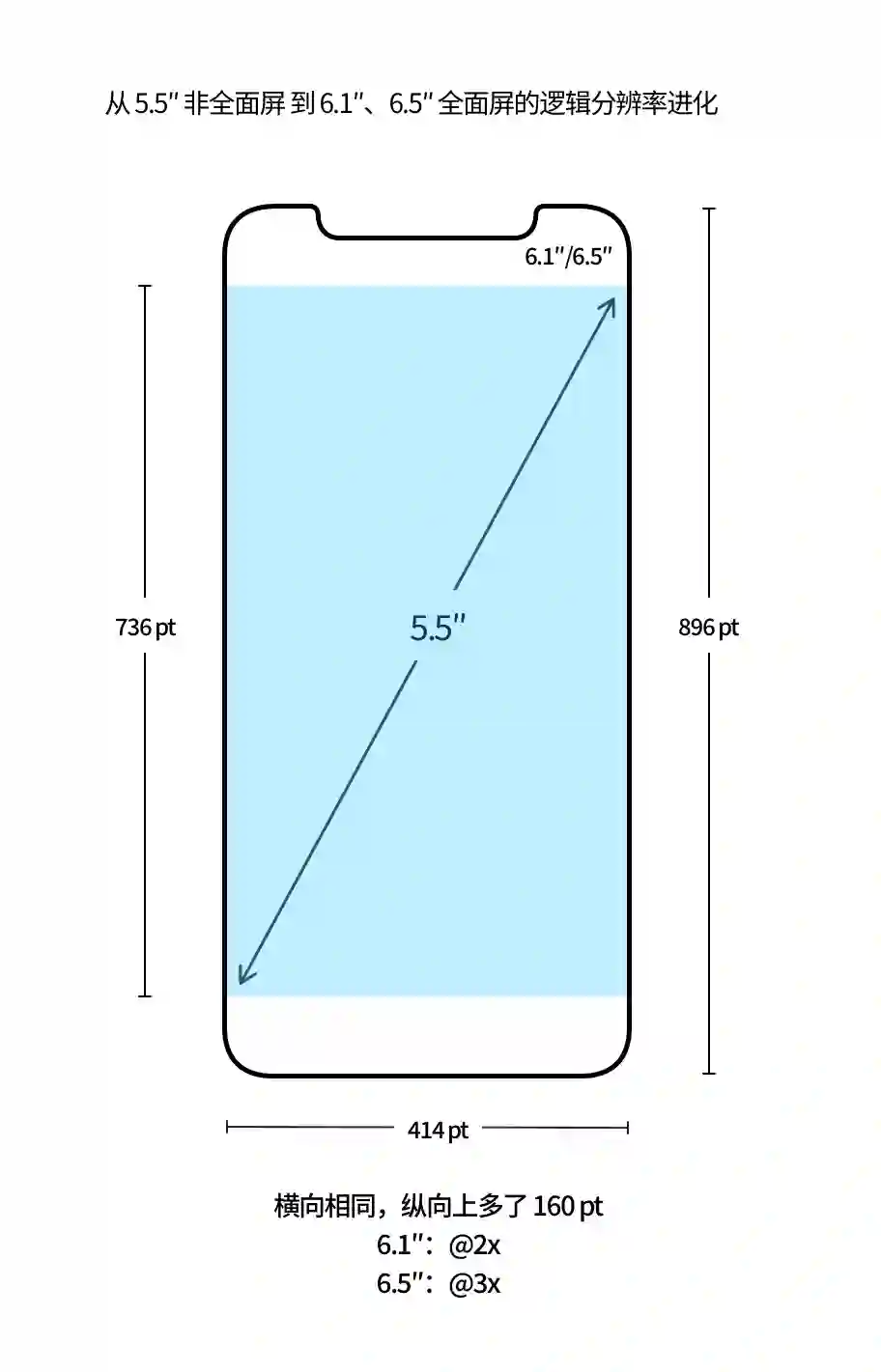 2018 年和 2019 年全面屏 iPhone 家族新增的 6.1 寸屏幕和 6.5 寸屏幕,它们虽然屏幕尺寸不同,但逻辑分辨率相同,都为 414×896pt,不同的是 6.1 寸的比例因子为 @2x,6.5 寸的比例因子为 @3x,所以它们显示的内容数量是相同的,但 6.5 寸的屏幕清晰度更高。