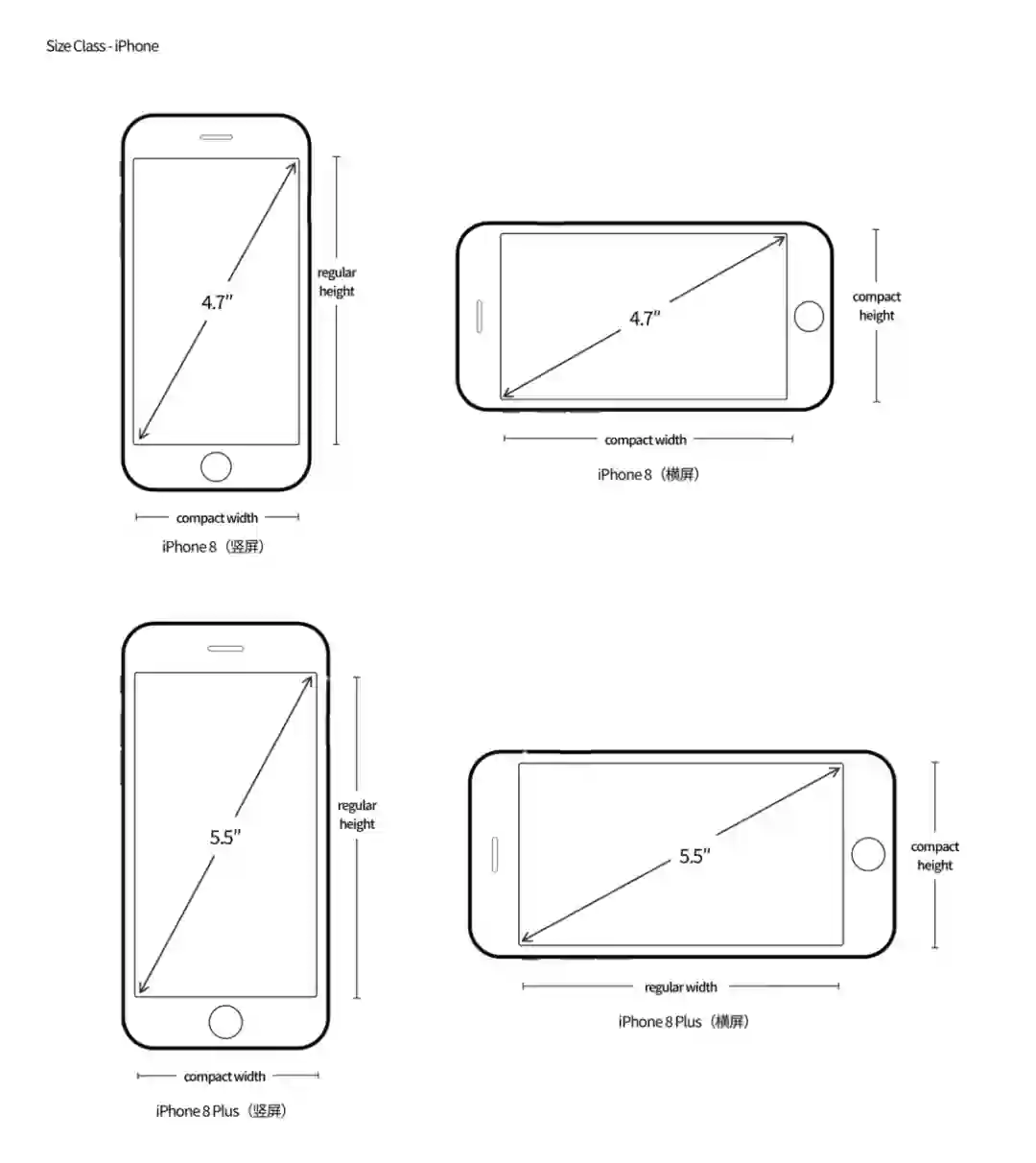 如下图,iPhone 8 在竖屏时的 Size Class 是「compact width,regular height」,在横屏时是「compact width,compact height」;iPhone 8 Plus 在竖屏时是「compact width,regular height」,在横屏时是「regular width,compact height」,与 iPhone 8 并不相同,因为 iPhone 8 Plus 屏幕尺寸更大。