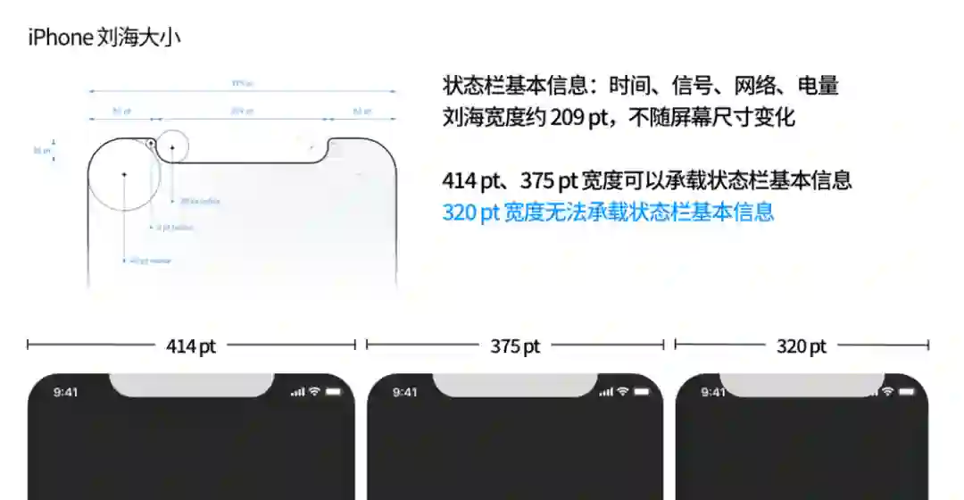 全面屏 iPhone 的刘海中包含的物理元器件并不随 iPhone 的屏幕尺寸所变化,根据网上找到的资料,刘海的宽度大概为 209pt。在目前放出的 iOS 14 Beta 版本中,刘海附近的状态栏显示区域(包含基本的时间、信号、网络和电量信息)并没有发生设计上的改变,而当把现有的状态栏放到 320pt 宽度的 iPhone 上时,会发现其无法承载现有的状态栏信息,那这是否可以推测 5.4 寸的 iPhone 12 抑或是整个 iPhone 12 系列的刘海会变得更窄更小呢?