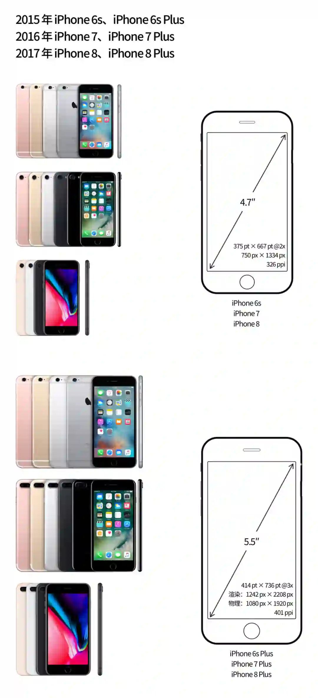 2015 年到 2017 年 Apple 相继发布了 iPhone 6s 和 iPhone 6s Plus、iPhone 7 和 iPhone 7 Plus、iPhone 8 和 iPhone 8 Plus,它们的屏幕参数与 iPhone 6、iPhone 6 Plus 保持了一致。4.7 寸和 5.5 寸屏幕的 iPhone 也在四年间迅速普及。